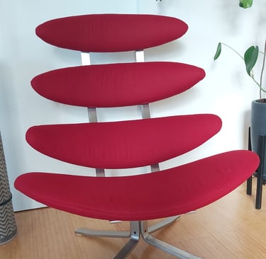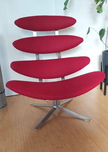 This vintage Poul Volther Corona chair was reupholstered in a beautiful soft-handed cherry red wool fabric, renewing comfort while respecting the chair’s iconic, sculptural design.